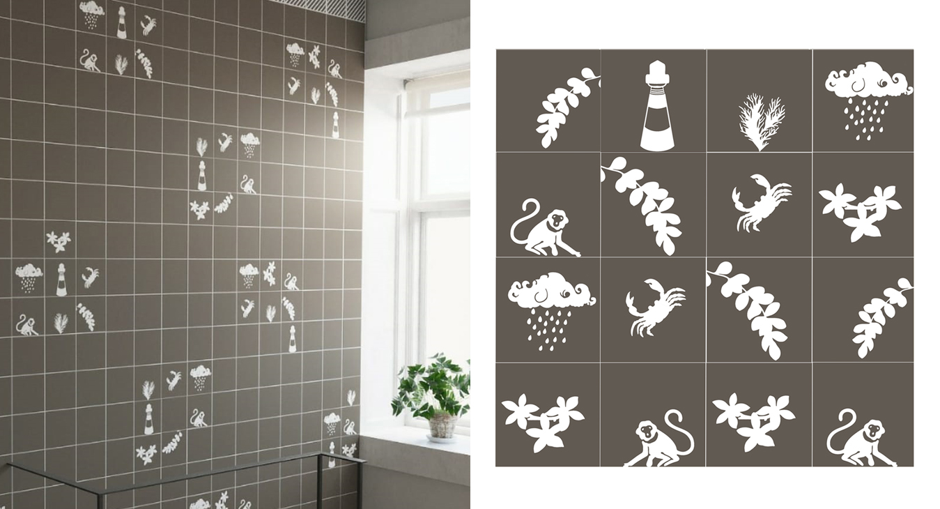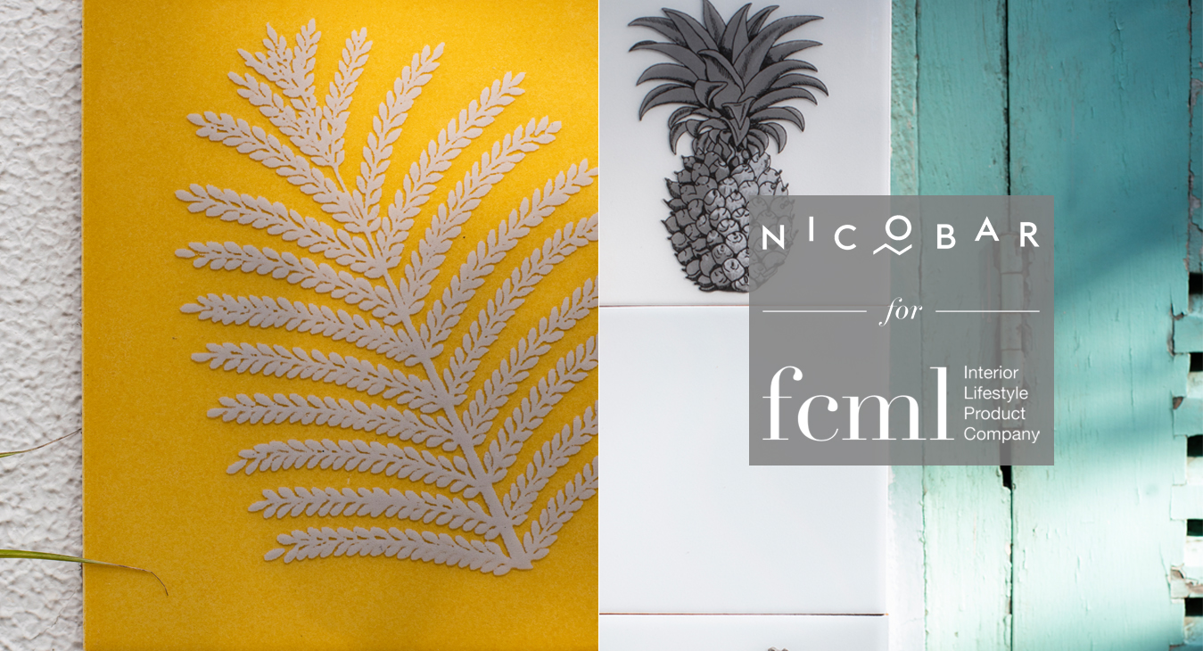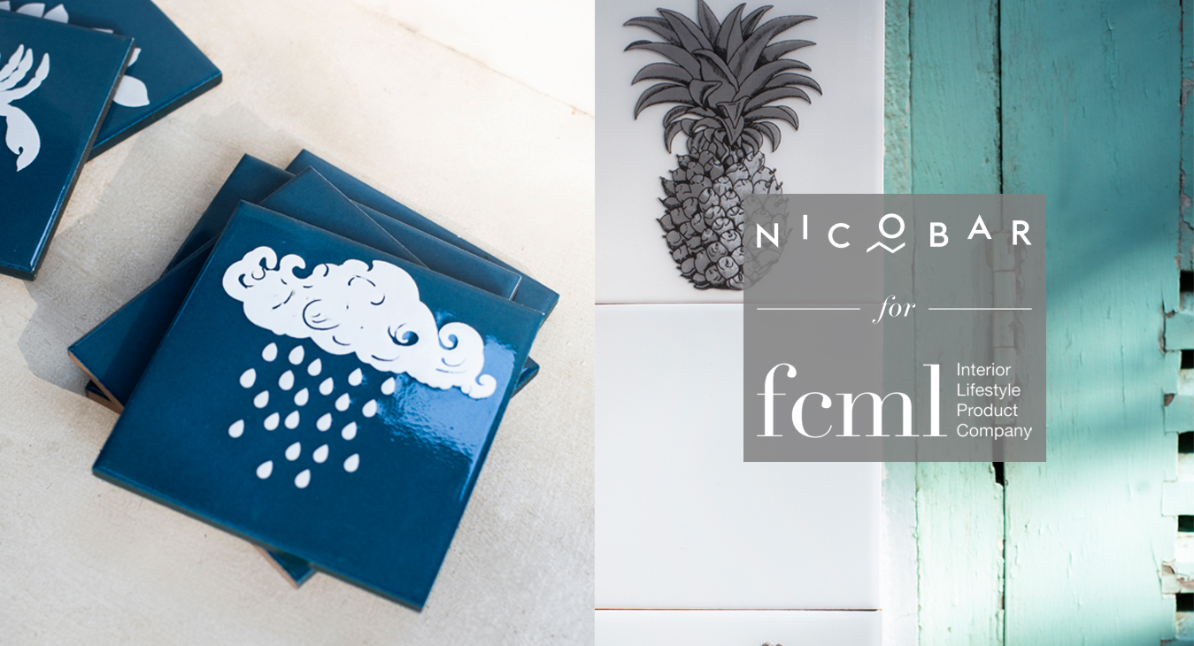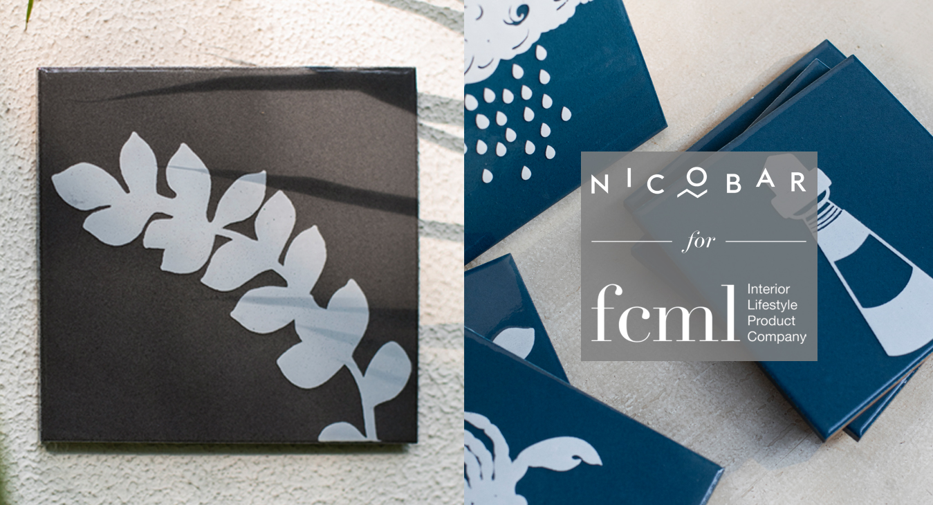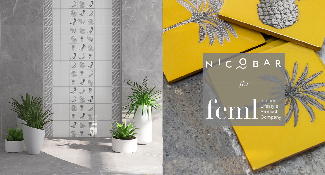 Our latest collaboration is with Nicobar, a modern Indian lifestyle brand, on a line of glossy ceramic wall tiles, in a soothing palette of teal, ivory, grey, and ochre, for both indoor and outdoor spaces. The 'Nicobar for FCML' capsule is a whimsical one, with flora, fauna, and motifs picked out from India’s vast coastline.