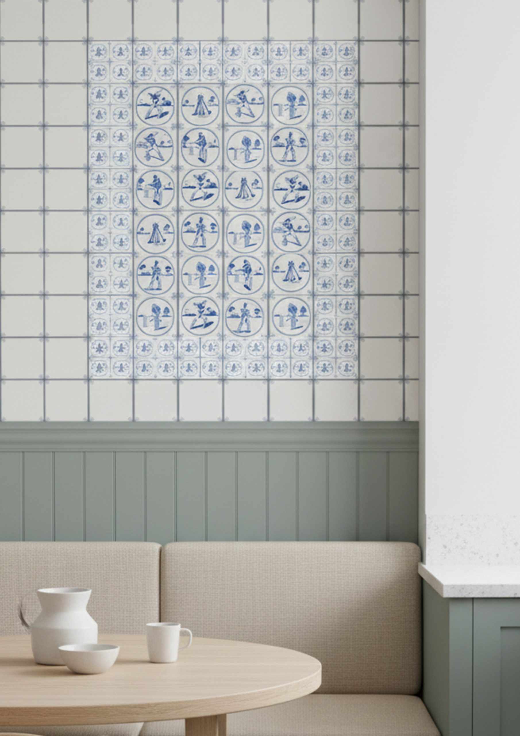 The Village Cricket Match, the classic book by John Parker, in which he describes ”the sun-drenched atmosphere beautifully evoked, the rustic swing, the rare and elegant late cut and the lucky six into the village pond,” is the inspiration behind this collection of classic Delft-style tiles aptly titled Howzat! Delft tiles have been popular for centuries and offer a classic and sophisticated look to any interior design, be it a Country Manor House or a Modern Rustic home. These modern yet classical tiles